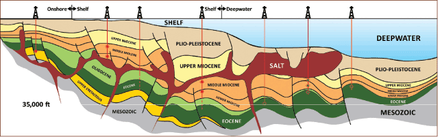 But nothing is easy. Among the challenges is a hovering sheet of salt that can measure 10,000 ft–16,000 ft and standing atop a treacherous layer of geologic junk. And the prize itself — the Lower Wilcox Trend, which lies as deep as 36,000 ft.