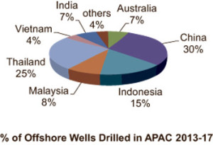 Thom Payne, Douglas-Westwood associate director in Singapore, estimates US$162 billion will be spent on offshore E&P in Asia Pacific over the next five years at a compound annual growth rate of 4%. Drilling spend will take up approximately 45% of that total, while Australia will account for approximately 27% of the drilling dollars, Indonesia 19% and Malaysia 11%. Of the offshore wells to be drilled in Asia Pacific between 2013 and 2017, it’s expected that 30% will be in China, 25% in Thailand and 15% in Indonesia.