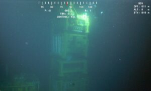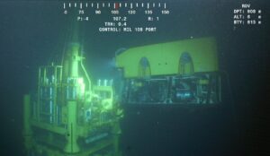 An ROV image of the completion/workover riser system latched onto the subsea Christmas tree.