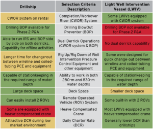 The majority of light well intervention vessels (LWIVs) surveyed were not suitable for the scope of work, mainly due to the riser-based requirement. This narrowed the selection to MODUs and a few purpose-built riser-based intervention vessels that were available in the market at the time.