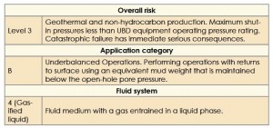 • Overall risk was Level 3: geothermal and non-hydrocarbon production. Maximum shut-in pressures less than UBD equipment operating pressure rating. Catastrophic failure has immediate serious consequences.