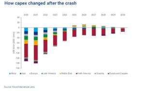 - Global upstream development spend for 2020 is 30% lower than the firm’s pre-crash view. North America is hit hardest, along with Africa and Asia. These regions may never recover to pre-crash levels;