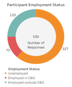 Among those surveyed, 62% were still unemployed, 13% were reemployed in oil and gas, and 25% were reemployed but in other industries. This means that, of all the respondents who had already found employment again, 66% of them were working outside the oil and gas industry.