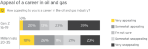 Not surprisingly, the poll revealed that Generation Z and Millennials do not tend to view the oil and gas industry favorably. Overall, 62% of Generation Z and 44% of Millennial respondents found the prospect of a career in the oil and gas industry to be unappealing.